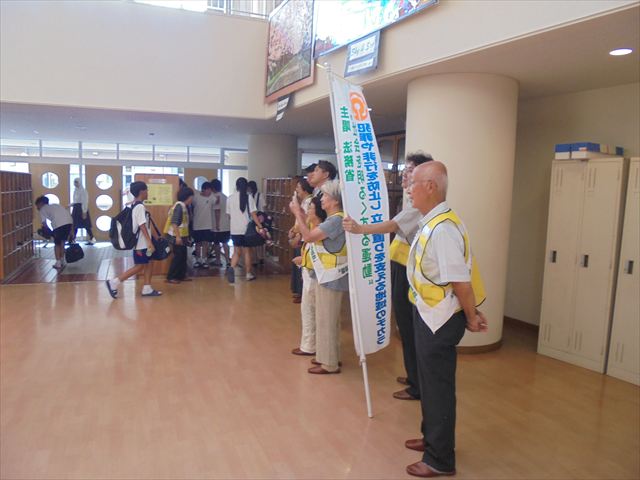 保護司会の方々と、本校生徒会執行部、生活福祉委員がコミュニティモールであいさつ運動を行いました。